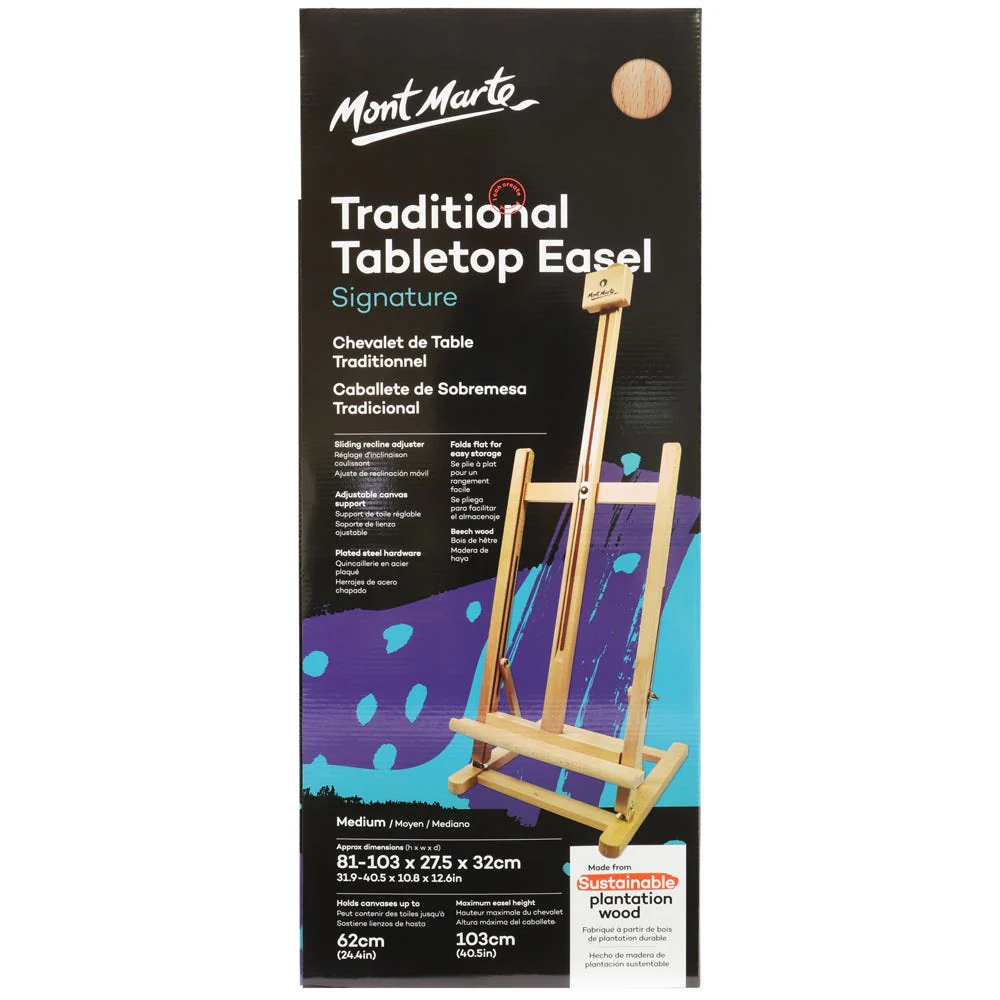 The Mont Marte Traditional Tabletop Easel is a portable, adjustable wooden easel designed for use on a desk or table, suitable for painting, drawing, or display purposes. It is available in various sizes and some versions feature a convenient storage drawer.