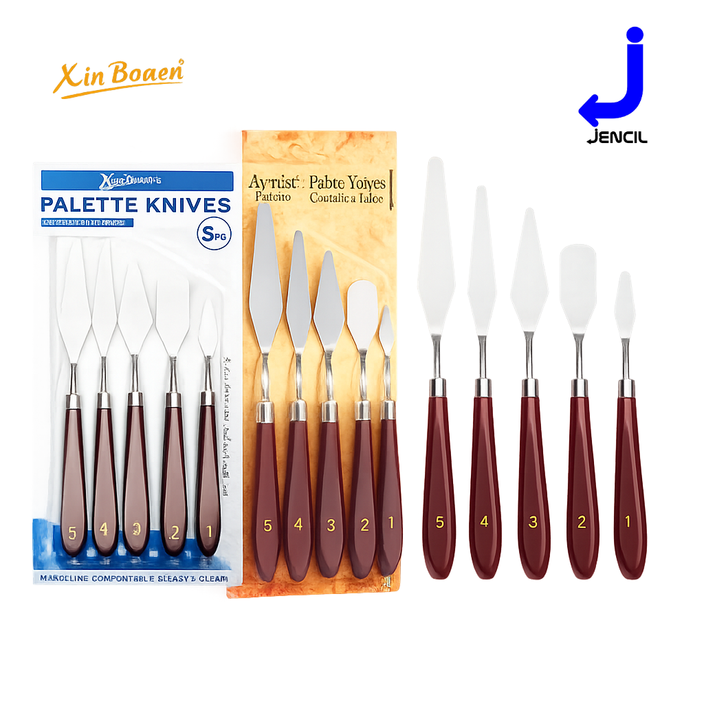 Palette Knives 5pcs Set Unlock your creativity with this versatile set of five artist palette knives. Each knife features a durable stainless steel blade and a comfortable wooden handle, designed for mixing colors, applying paint, and creating stunning textures. With a variety of blade shapes and sizes, this set is perfect for acrylics, oils, and other mediums—whether you’re blending smooth gradients or adding bold, expressive strokes. Easy to clean and built for long-lasting use, it’s an essential toolset for every artist’s studio.